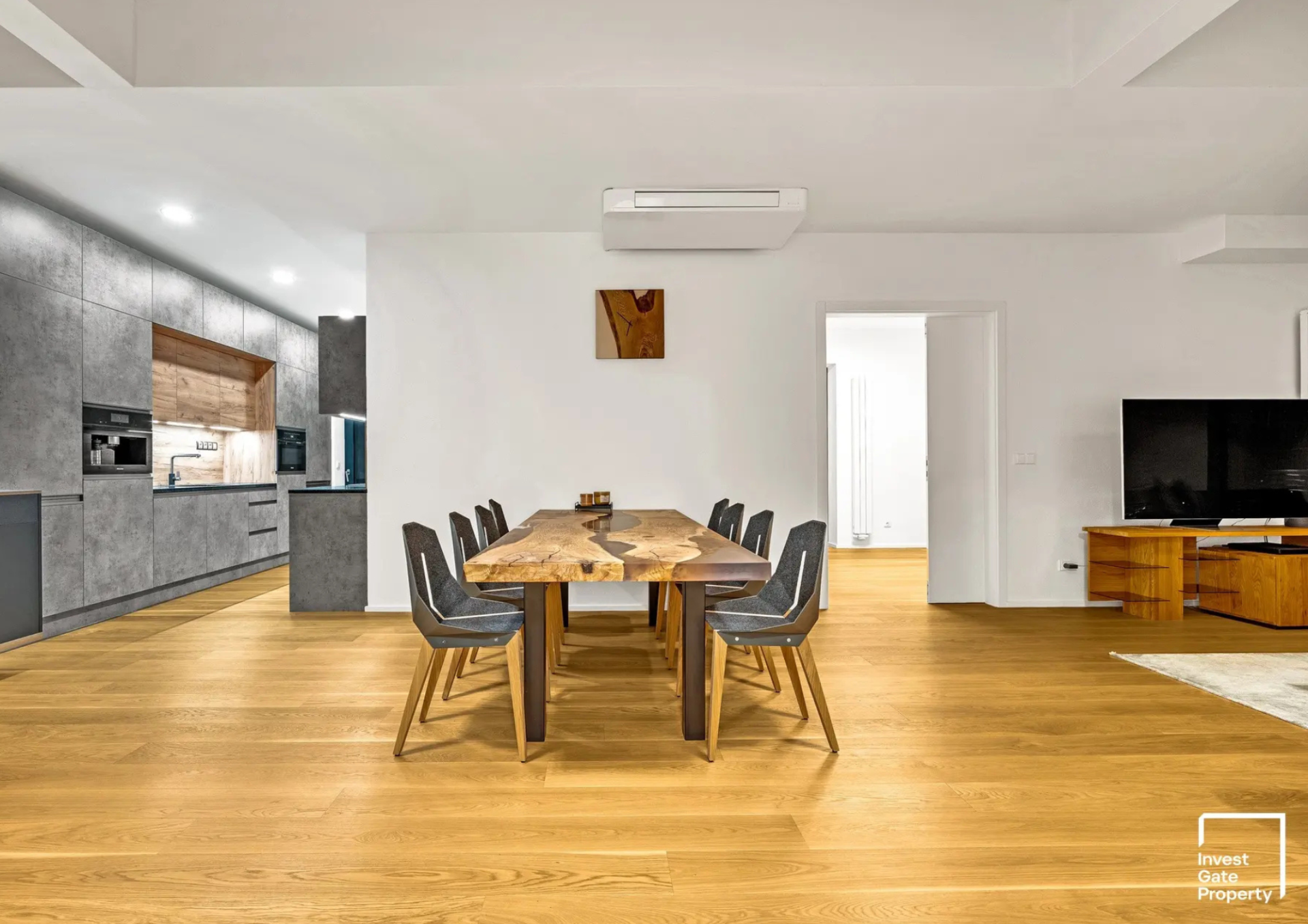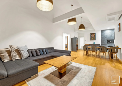 Interiér je řešen s důrazem na kvalitu a dlouhodobou hodnotu. Masivní dřevěné podlahy, nábytek na míru, špičkové spotřebiče i promyšlené detaily dávají prostoru přirozenou eleganci a komfort, který je cítit v každé části bytu. Součástí je také privátní sauna a klimatizace ve všech obytných místnostech.